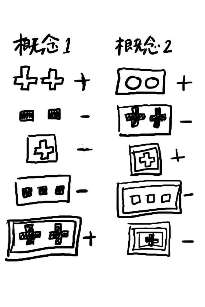 これらは概念の定義に当てはまるものたちを+か-で表したものです。
