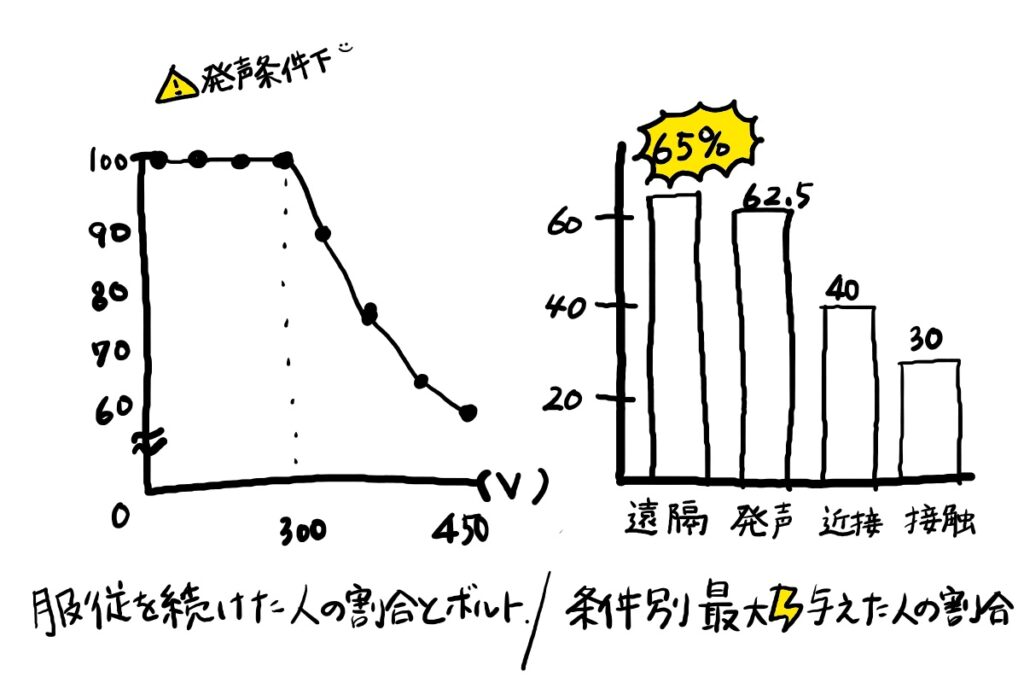 ・サクラは、わざと間違え、4分の3に誤答します。また、電気ショックでは、120Vからうめき声をあげ、330Vまでうめき声が強くなり、それを超えると無反応になる、というリアクションをとります。