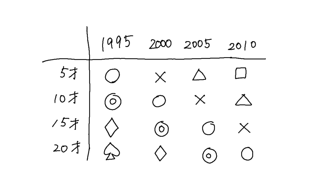 これは横断的・縦断的研究法のそれぞれの長所と短所を融合させたような方法になります。シャイエの最も効率的なデザインと呼ばれます。これは、年を経るごとに対象者が欠落してしまうという縦断的研究の短所を補うため、新しく研究を行うごとに対象者を増やすことで補っていく形になります。図で表すとこのようになります。↓同じ記号が同じコホートだと考えてください。